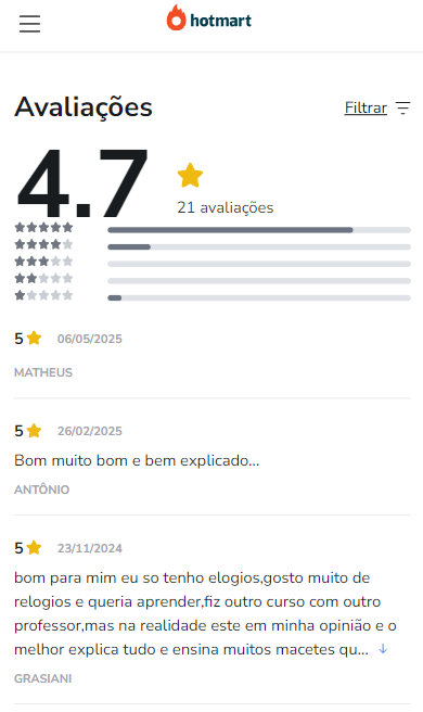 Com nota média de 4,7/5 estrelas e inúmeros depoimentos positivos, o Ajustando os Ponteiros se tornou uma referência nacional em ensino prático de relojoaria.