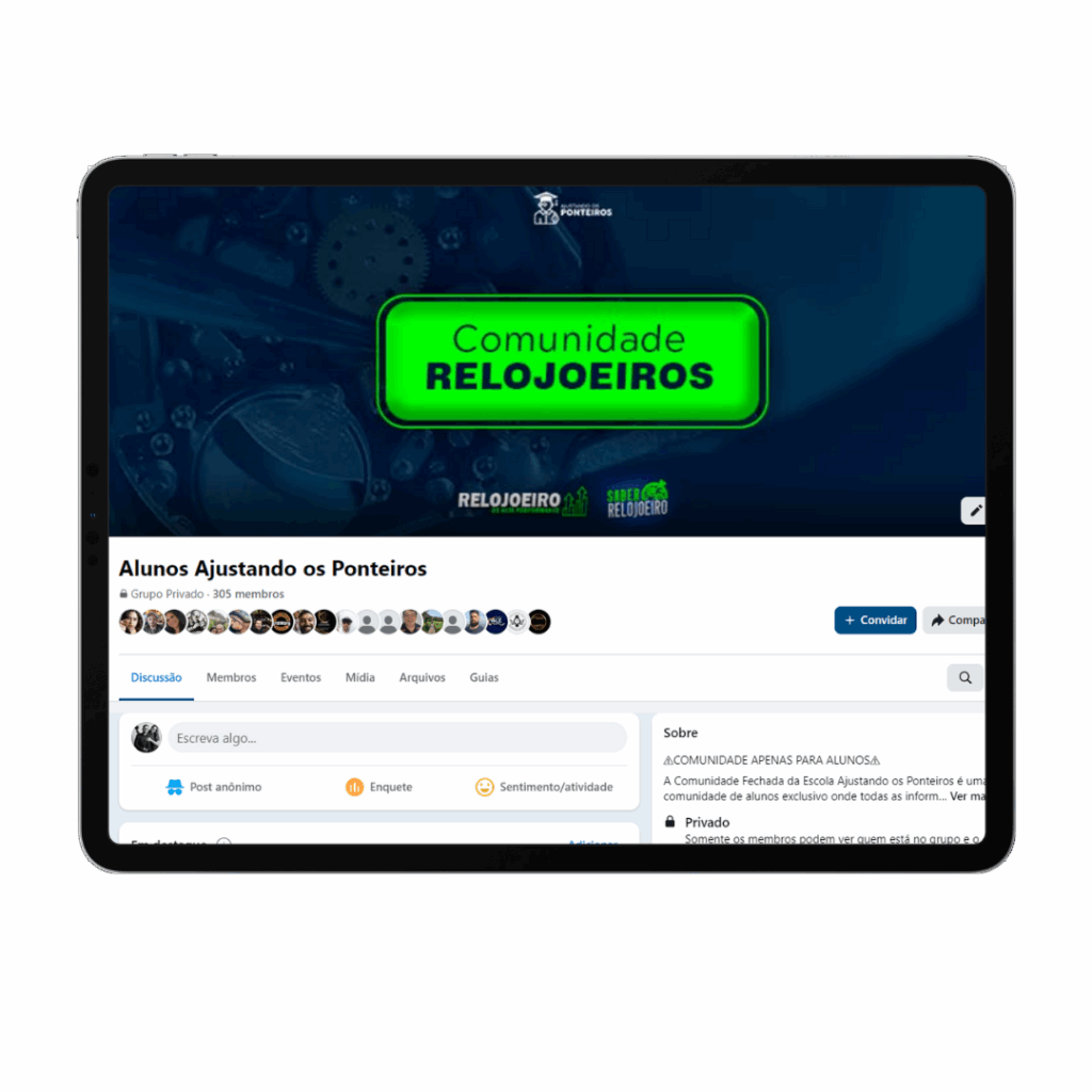 Tenha acesso a uma comunidade fechada no Facebook com mais de 300 alunos ativos, onde é possível trocar experiências, tirar dúvidas e acompanhar a evolução de outros relojoeiros.